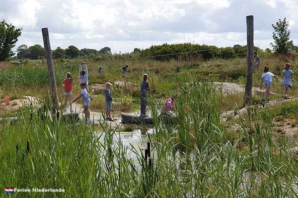 Zieh Deine Schuhe aus -und schon kann das Abenteuer beginnen! Auf dem Wattspielplatz gibt es Priele und Inseln, die Ebbe und Flut simulieren. Klettere an den Seilen auf die andere Seite und fang mit einem Fischernetz kleine Tiere im Wasser. Natürlich gibt es auch eine Stelle, wo Du nachher Deine Füße abspülen kannst. Deine Eltern können inzwischen auf der Terrasse des Sommerpavillons Platz nehmen und die Aussicht genießen.